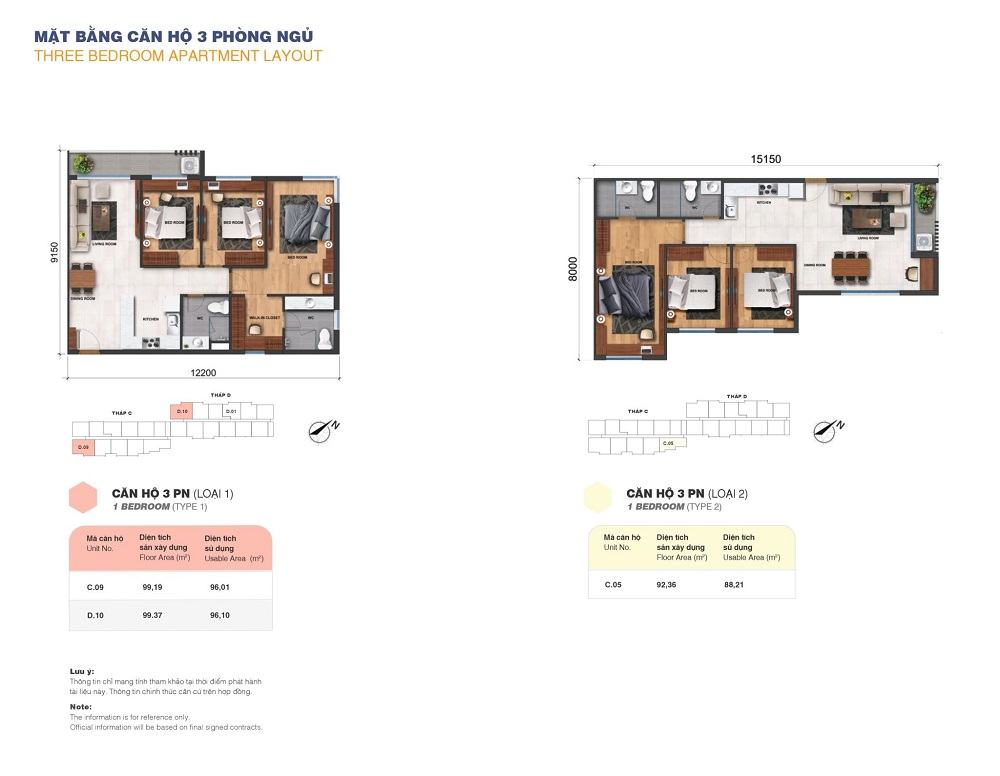 | Căn hộ 3 phòng ngủ – 2 nhà vệ sinh | 80 – 99m2 | 3.2 – 3.5 tỷ | |