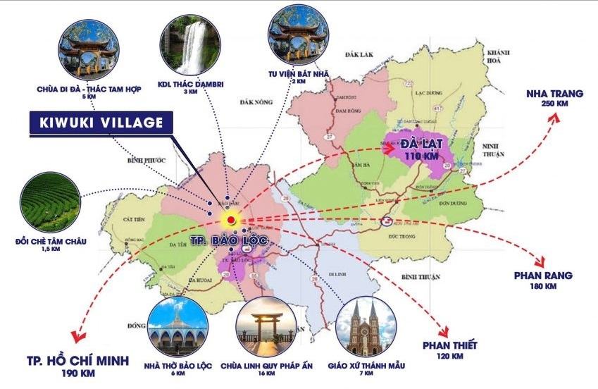 Dự án Kiwuki Villages nằm trên trục đường Tôn Thất Thuyết, vị trí đắc địa chỉ cách khu du lịch DamBri khoảng 8km và trung tâm TP. Bảo Lộc khoảng 9km. Đặc biệt trong vòng bán kính 2km, cư dân Kiwuki Villages dễ dàng kết nối đến cao tốc Dầu Giâu – Đà Lạt, Khu du lịch Vườn Trà Tâm Châu cũng như thung lũng, quán café The Tulip, biệt thự Sun Valley…