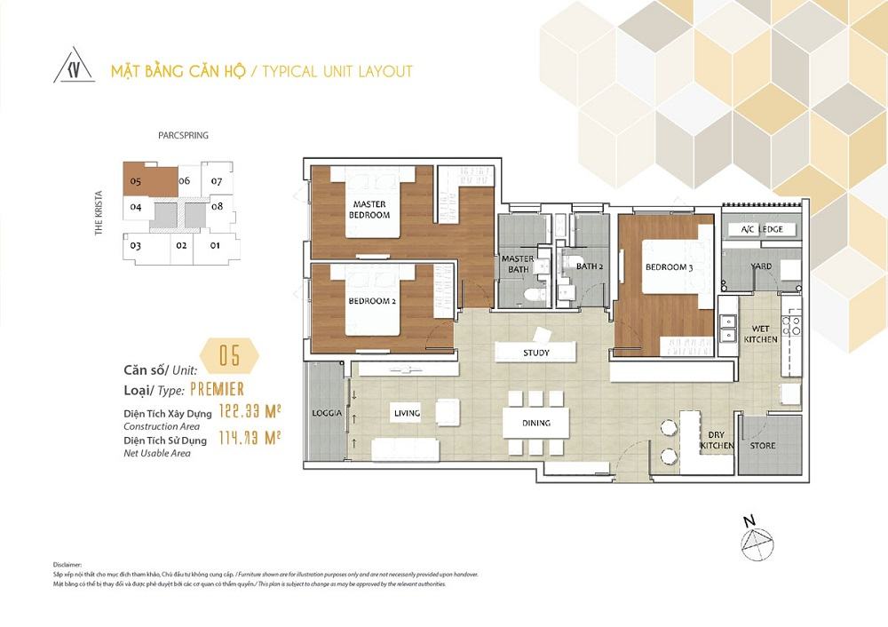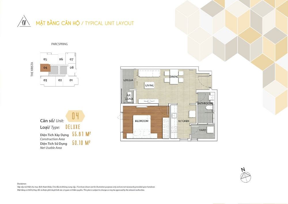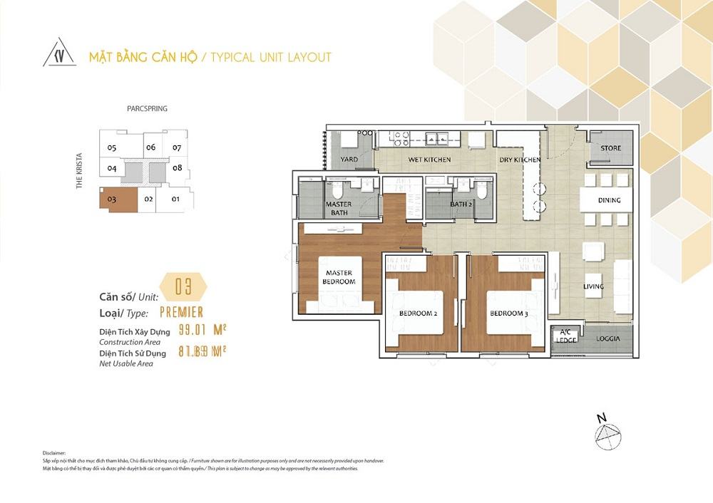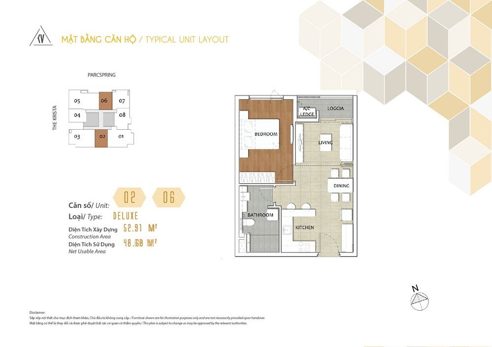 Kris Vue có khuôn viên triển khai xây dựng với diện tích 2.066 m2 bao gồm có 1 tầng hầm và 17 tầng cao, cung cấp cho thị trường 128 căn hộ. Các căn hộ của dự án được thiết kế theo đúng tiêu chuẩn khách với với 3 loại hình có từ 1- 3 phòng ngủ, diện tích từ 48,68 – 114,13 m2.