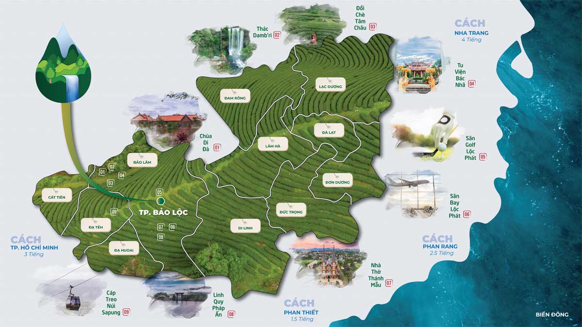 Toạ lạc ngay ngã 5 Damb’ri, Thành Phố Bảo Lộc, Tỉnh Lâm Đồng. Cách trung tâm Bảo Lộc chưa đầy 12km, thuận tiện đi lại qua 2 tuyến đường Lý Thái Tổ hoặc Lý Thường Kiệt