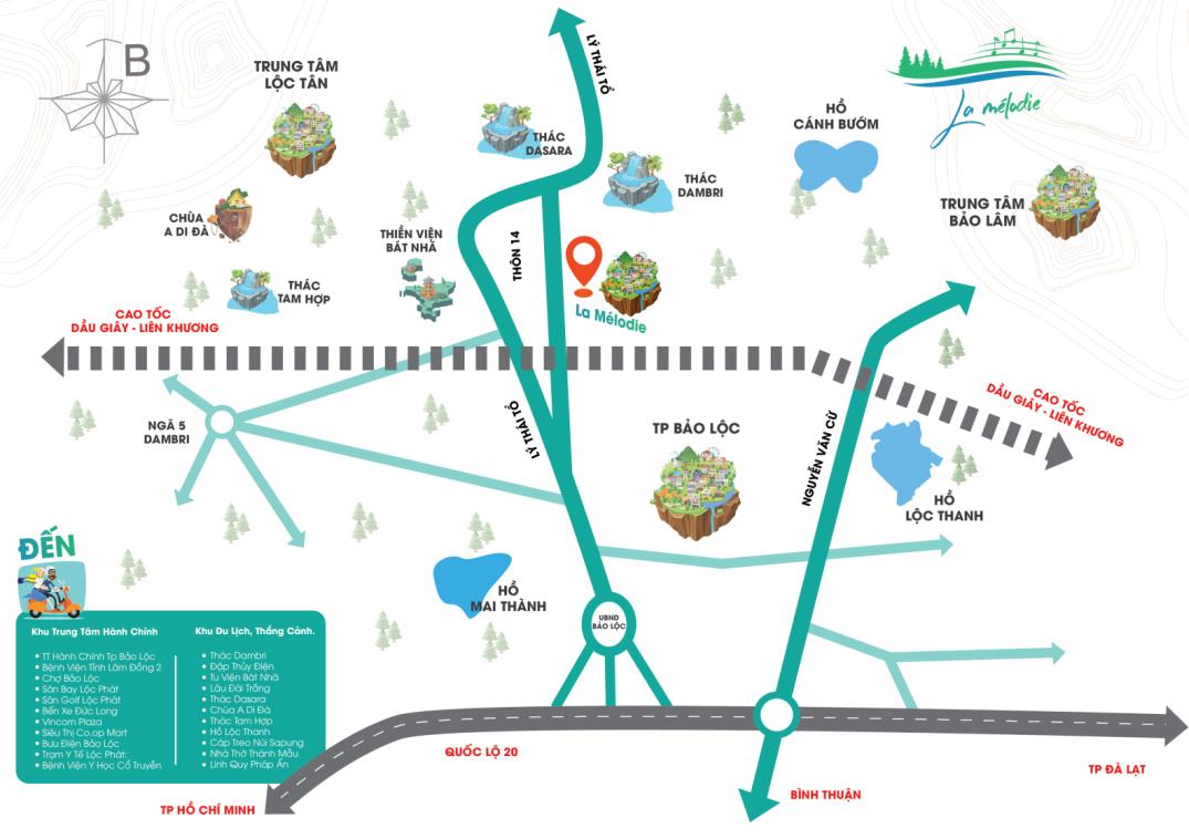 La Melodie Bảo Lộc sở hữu vị trí vô cùng đắc địa hoàn hảo thuận tiện di chuyển đến kh vực lân cận chỉ từ 2 – 5km: