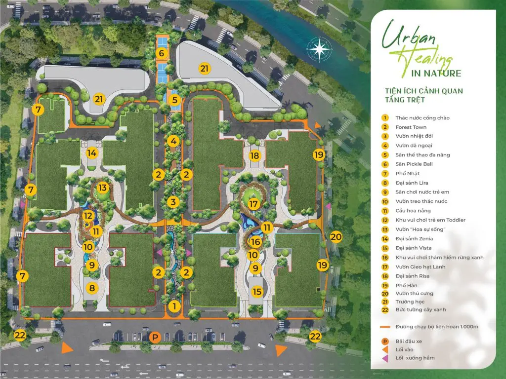 Ốc đảo xanh nội khu: Suối nhiệt đới cảnh quan chảy uốn lượn, công viên cây xanh rộng lớn và các khu vườn treo mang đến không khí trong lành tuyệt đối.