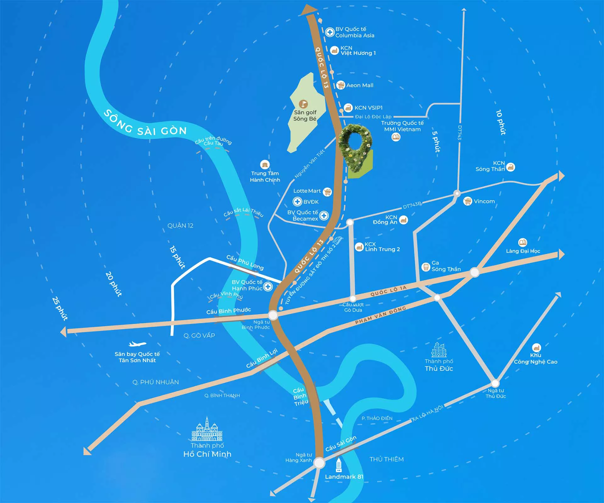 Chỉ 15 – 20 phút: Tiếp cận cửa ngõ TP.HCM (Thành phố Thủ Đức) thông qua trục Quốc lộ 13 hoặc đại lộ Phạm Văn Đồng.