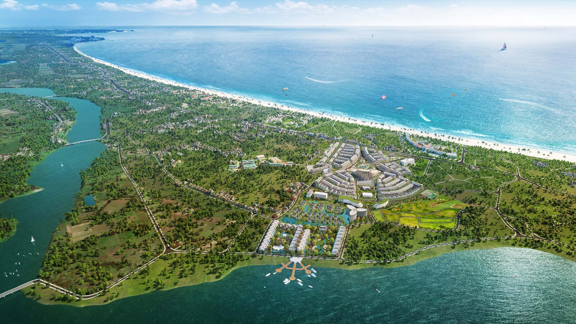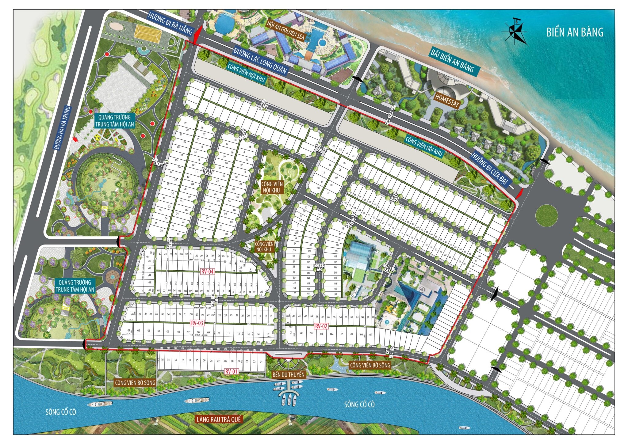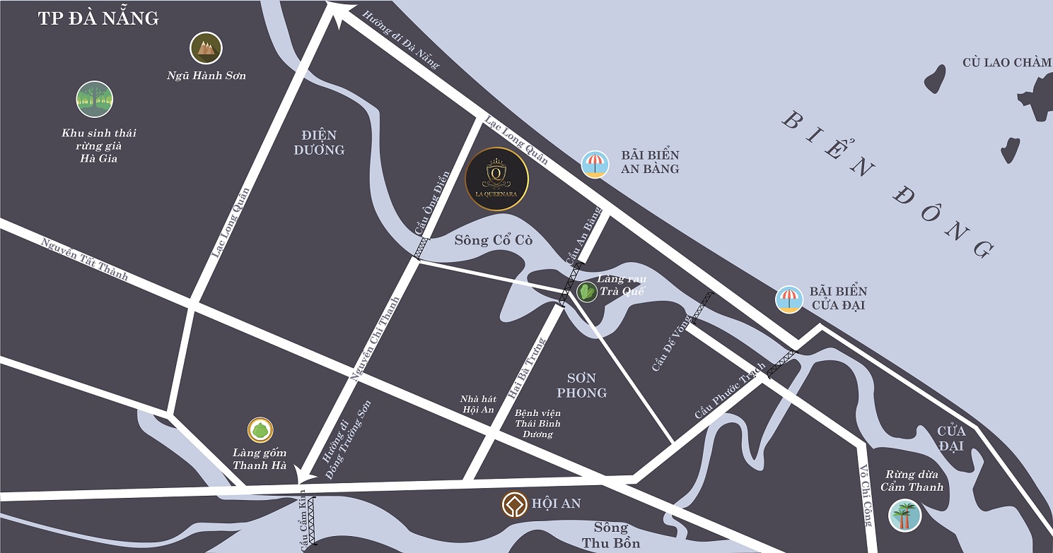Dự án La Queenara tọa lạc trên tyến đường Lạc Long Quân nối Đà Nẵng – Hội An, nằm bên dòng sông Cổ Cò thơ mộng và bãi biển An Bàng – top 50 bãi biển đẹp nhất thế giới.