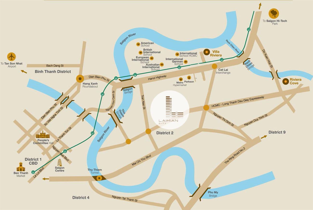 Vị trí địa chỉ dự án Laimian City nằm trên trục đường Lương Định Của Quận 2 với các liên kết giao thông vô cùng tiện lợi. Từ dự án ngay Trung Tâm của quận 2 không chỉ dễ dàng di chuyển đến các khu vực lân cận như Quận 1, Quận 4, Quận Bình Thạnh mà còn thuận tiện về mặt cơ sở hạ tầng khi HDTC cùng với nhà nước nâng cấp, chỉnh trang lại tuyến đường huyết mạch Lương Định Của tại Quận 2. Với một vị trí đầy tiềm năng hứa hẹn sẽ làm tăng giá trị của bất động sản Quận 2 nói chung và Laimian City nói riêng.