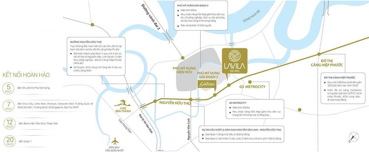 Lavila De Rio nằm ngay tại trục đường quan trọng Nguyễn Hữu Thọ, đây là khu vực phát triển nhanh chóng bởi xung quanh phạm vi chỉ vài km là hàng loạt các dự án, Khu dân cư và Khu đô thị với quy mô khủng như: Khu đô thị Phú Mỹ Hưng; Khu đô thị cảng Hiệp Phước;… các dự án lớn của các ông lớn như Phú Long; VinaCapital, Hoàng Anh Gia Lai, Quốc Cường, Hưng Lộc Phát… Tất cả đã giúp cho khu vực phía Nam Sài Gòn phát triển nhanh chóng trong tương lai, trở thành một thành phố năng động.
