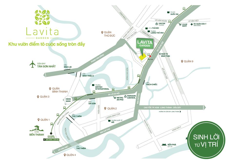 Lavita Garden giúp cư dân tránh xa sự ồn ào, xô bồ của đô thị. Cùng với đó là cư dân chỉ cần vài phút tới với các khu vực như: Quận Thủ Đức; Quận 2; quận 9 cũng như trung tâm thành phố.