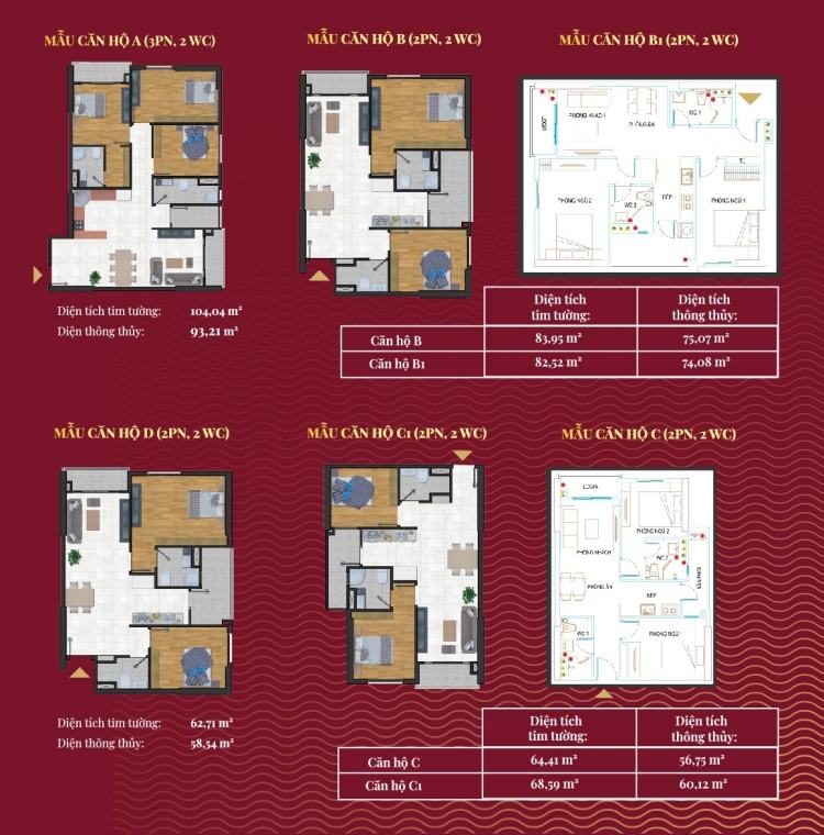Diện tích từ: 62,71 – 104,04 m2 thiết kế 2PN – 3PN