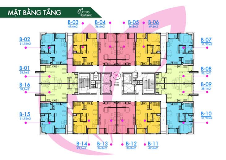 Mỗi tầng của căn hộ chỉ bao gồm 16 căn, con số ấn tượng không nhiều dự án có được. Với mật độ như thế này, đử để bạn cảm thấy sự thoải mái ở khắp mọi nơi trong khu vực dự án Lotus Apartment bạn đang sinh sống.