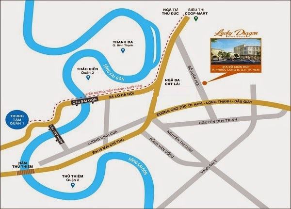 Nhà phố Lucky Dragon sở hữu vị trí tọa lạc tại số 41A đường Đỗ Xuân Hợp, Phường Phước Long B, Tp. Thủ Đức. Nhờ vị trí tọa lạc đắc địa này mà cư dân nơi đây có thể dễ dàng di chuyển tới các khu vực trung tâm, quận lân cận như: tới với quận 1 chỉ mất khoảng 15 phút đi lại qua tuyến đường cao tốc Long Thành – Dầu Giây; Mai Chí Thọ và trong tương lai là tuyến Metro số 1.