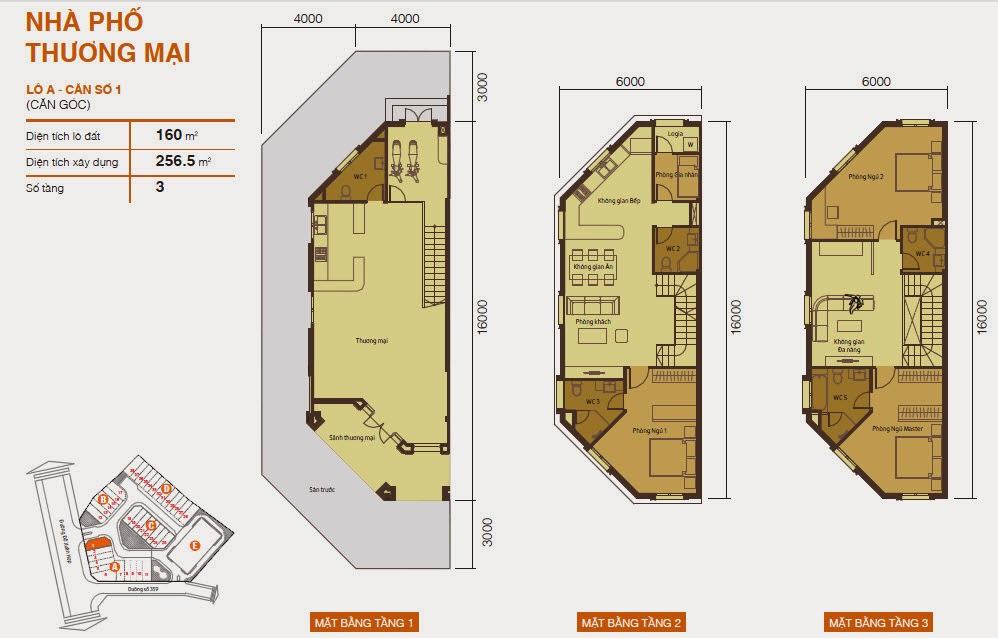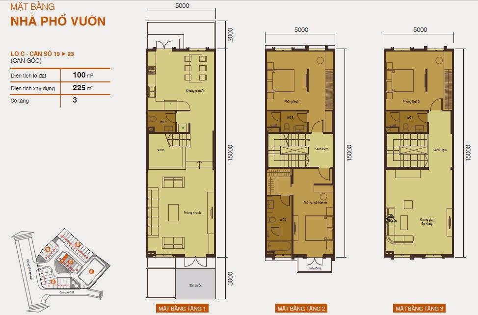 – Block C: Nhà phố vườn 5 x 20 = 100 m2; Diện tích xây dựng: 5 x 15 = 75 m2.