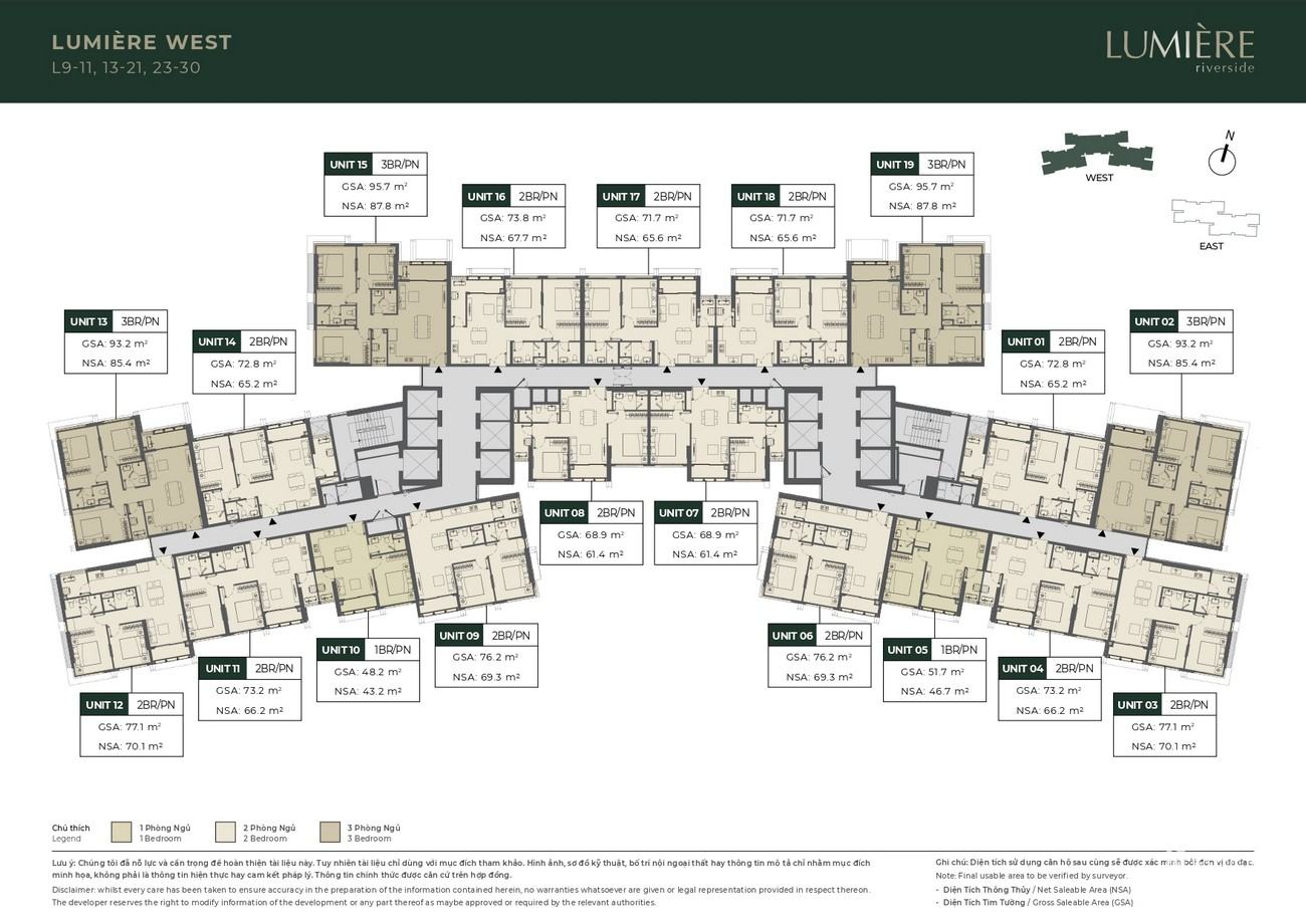 Mặt bằng chi tiết căn hộ Masteri Lumière Riverside được xây dựng trên tổng quỹ đất rộng 19,395 m2, có đầy đủ các loại căn hộ từ 1 – 3 PN cho đến các sản phẩm cao cấp như Penthouse, Duplex giúp khách hàng có đang dạng sự lựa chọn với nhu cầu và tài chính của riêng mình. Dự án Masteri Lumiere Riverside sở hữu 2 block Lumiere East (36 tầng) và Lumiere West (44 tầng).
