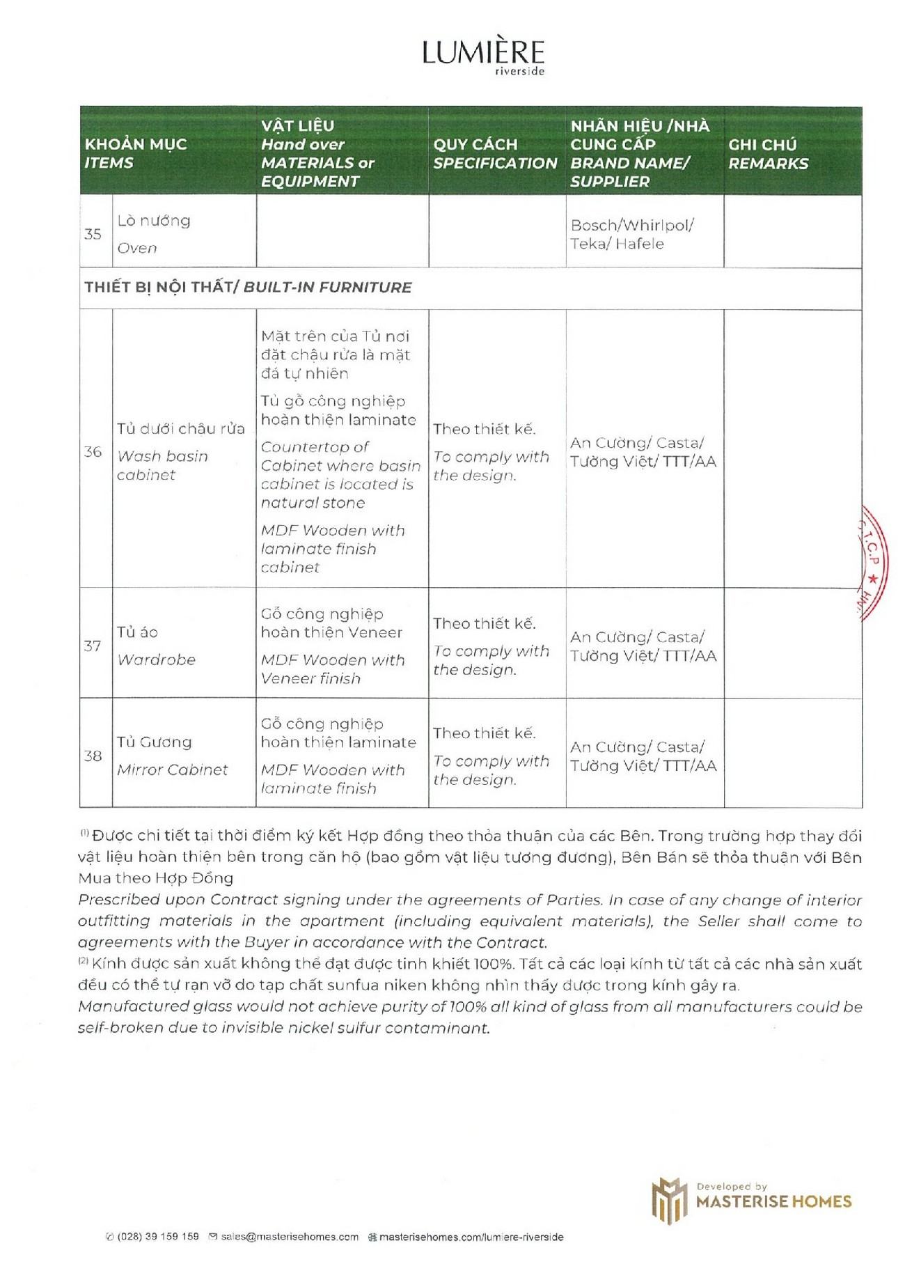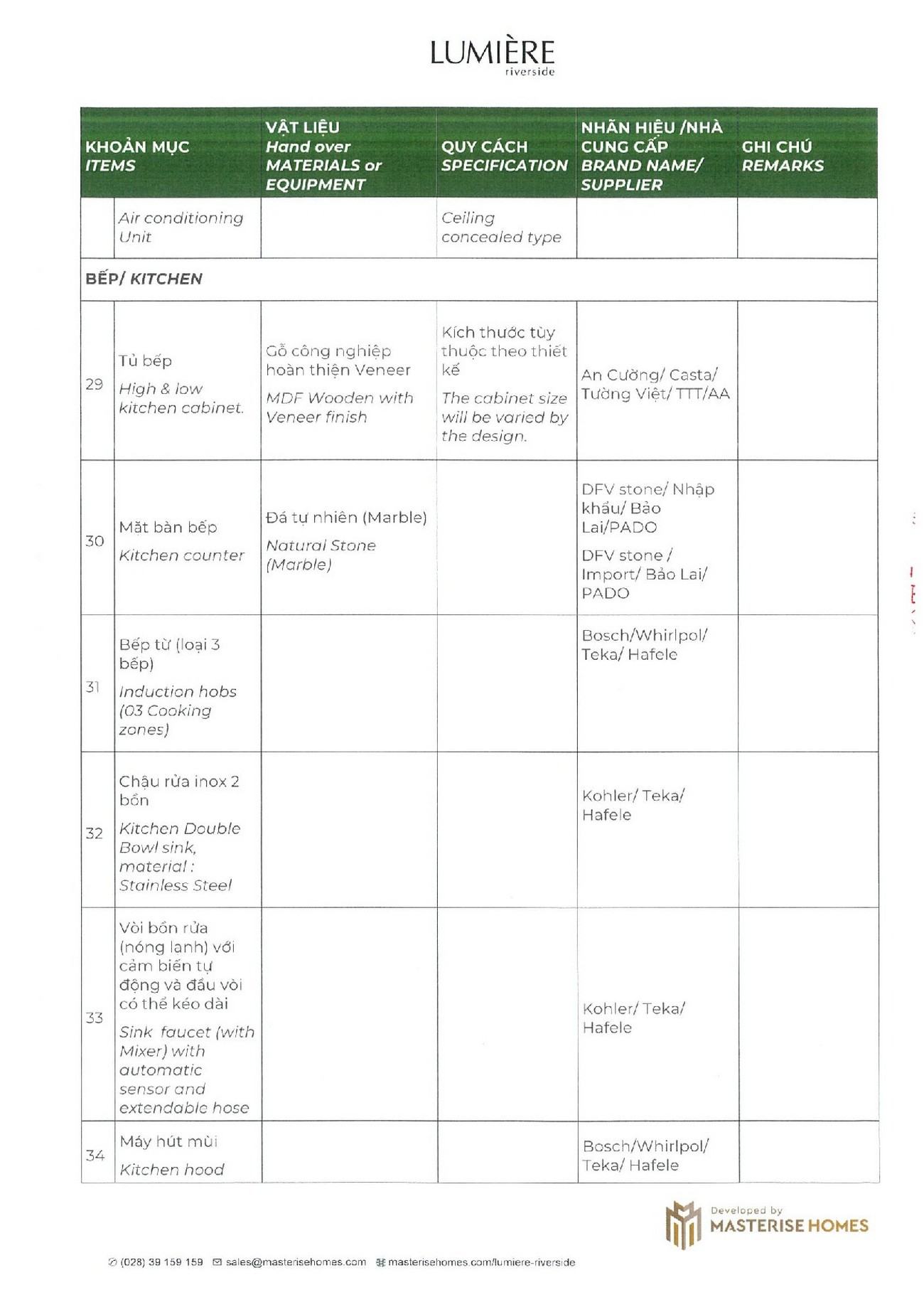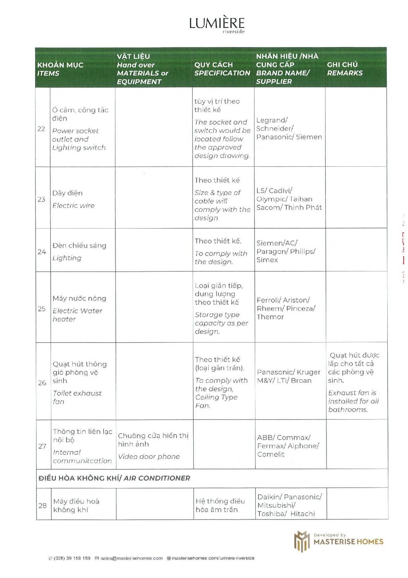 Nội thất bàn giao căn hộ Masteri Lumiere Riverside được thiết kế với những gam màu hài hòa mang đến không gian ấm cúng. Nội thất được lắp đặt, bố trí khoa hoạc và rất tinh tế khiến căn nhà của bạn thêm rộng rãi, tiện nghi hơn, đi cùng với đó là chất lượng được đảm bảo bởi các thương hiệu uy tín trong và ngoài nước. Đặc biệt hơn nữa, nội thất của dự án Masteri Lumiere Riverside còn được được trang bị bởi tập đoàn thiết kế nội bất HBA hàng đầu thế giới. Dưới đây là danh sách nội thất điển hình bên trong căn hộ Lumiere Riverside.