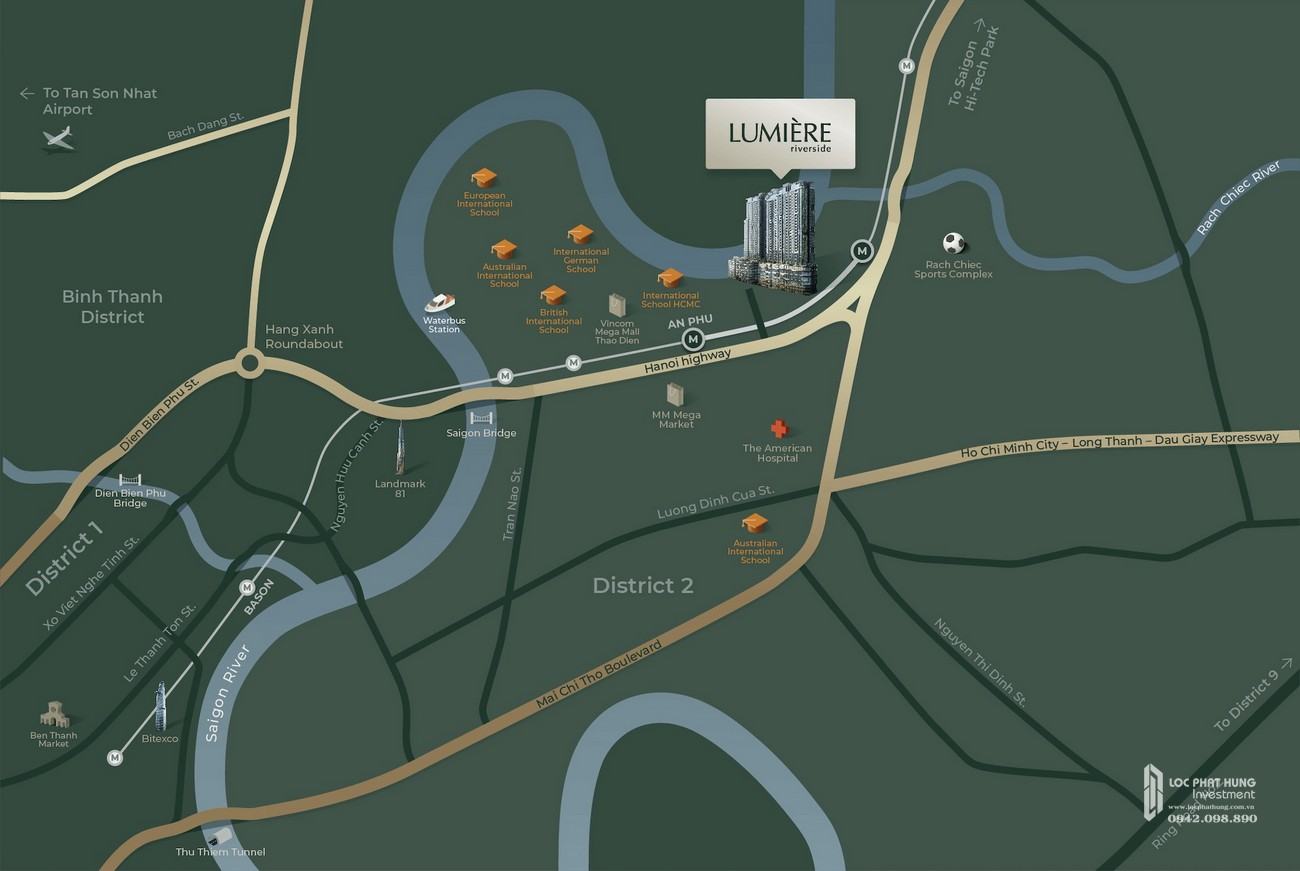 Vị trí dự án căn hộ Masteri Lumiere Riverside Quận 2 tọa lạc tại số 628 Xa Lộ Hà Nội, Phường An Phú, Quận 2, TP. HCM. Tổng diện tích dự án khoảng 1.9 ha, nằm liền kề Masteri An Phú – thuộc khu vực cộng đồng dân cư thành đạt – nơi tập trung hàng loạt các dự án cao cấp bậc nhất Sài Thành, có thể kể đến các công trình hưng thịnh như: Masteri Thảo Điền, Masteri An Phú, Gateway Thảo Điền, The Vista, The Nassim, KĐT City Hourse… Vị trí của Lumiere Riverside có tầm nhìn 360 sông Sài Gòn và Thành Phố, cảnh sắc giao hòa giữa thiên nhiên và cuộc sống hiện đại.