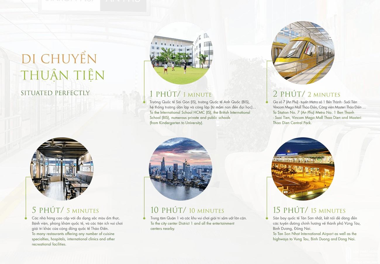Vị trí kim cương Thảo Điền kết nối hoàn hảo đến mọi khu vực trung tâm thành phố và sân bay quốc tế Tân Sơn Nhất với đa dạng phương tiện, từ xe máy, ô tô cho đến tuyến metro số 1 Bến Thành – Suối Tiên hay tuyến buýt đường sông và di chuyển đến các tỉnh thành lân cận như Vũng Tàu, Bình Dương bằng hệ thống giao thông hiện đại.