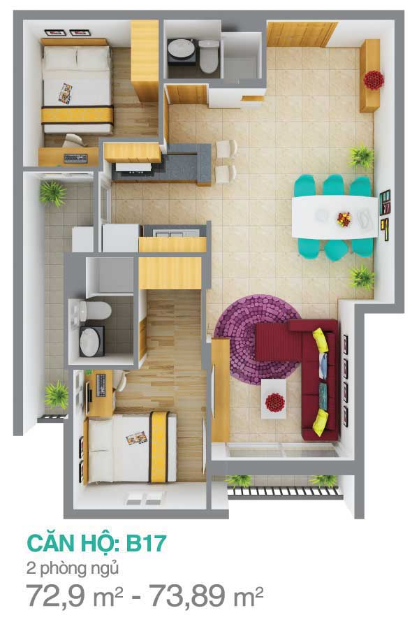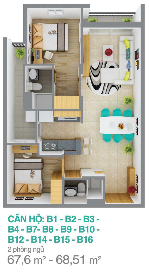 • 2 phòng ngủ ( từ 66,9m2 – 73 m2)