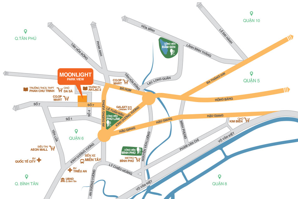 +Vị trí nằm ngay tại giao điểm của Quận Bình Tân, Quận Tân Phú, Quận 6, Quận 8 và các tỉnh miền Tây khác vì thế Moonlight Park View sẽ là một lựa chọn thích hợp cho những khách hàng hiện đang làm việc hay thường xuyên di chuyển đến các khu vực trên.