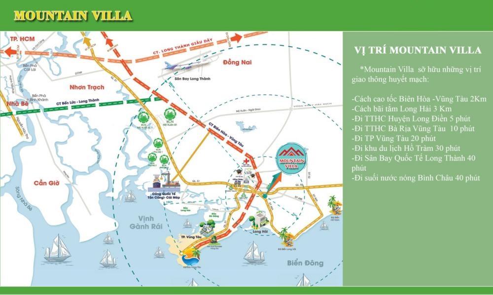 Mountain Villa là dự án đất nền Biệt thự nằm liền kề đường 44A, Long Điền, Bà Rịa – Vũng Tàu được Công Ty TNHH Xây Dựng Đầu Tư Phát Triển House Land làm chủ đầu tư, xung quanh dự án là khu dân cư hiện hữu, hệ thống điện, nước sạch có sẵn, đường nội bộ từ 8 – 12 mét, giá bán của Mountain Villa chỉ từ 3.5 triệu/m2.