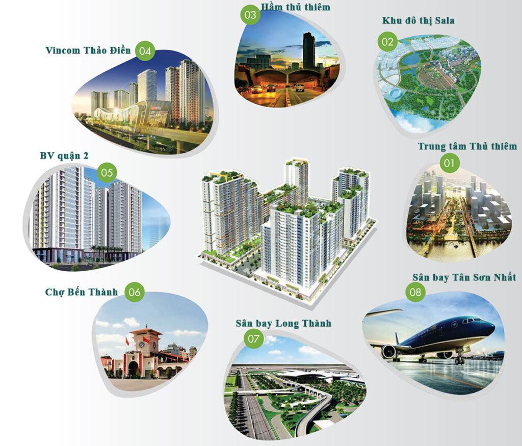 Trung tâm thương mại: Chỉ mất 7 phút để đến các trung tâm thương mai lớn, sầm uất ở Thảo Điền, An Phú An Khánh như: Vincom Mega Mall, Parkson, Metro An Phú… Tại đây cư dân có thể thoả thích mua sắm các loại hàng hoá như: Nhu yếu phẩm, hàng thời trang, công nghệ từ các thương hiệu lớn, nổi tiếng. Hoặc có thể vui chơi, ăn uống tại các nhà hàng, cafe, giải trí với các bộ phim bom tấn trong rạp chiếu phim sang chảnh bậc nhất.