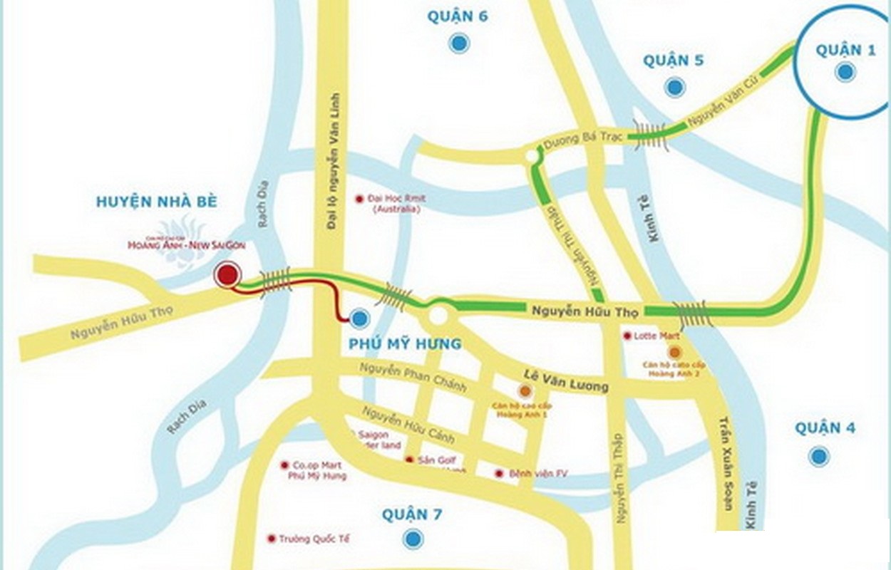 Tọa lạc tại đường Nguyễn Hữu Thọ – trục đại lộ Bắc Nam, cách trung tâm thành phố 5km theo hướng cầu Kênh Tẻ (khoảng 15 phút chạy xe), giáp ranh khu đô thị Phú Mỹ Hưng và KDC Trung Sơn đi về hướng cầu Nguyễn Văn Cừ là nút giao thông quan trọng đi về hướng Quận 1, Quận 5 và Quận 10 rất nhanh chóng và thuận tiện.