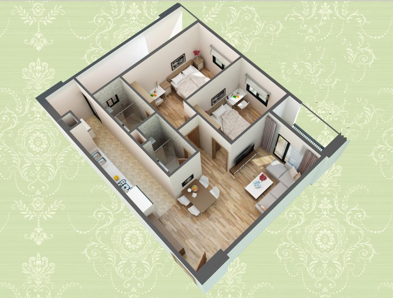Mỗi căn hộ có mẫu mã, kiểu dáng tinh tế có 1 phòng khách, 2 phòng ngủ, 1 bancol, 1 nhà bếp kết hợp phòng ăn. Giữa các không gian có sự liên kết chặt chẽ với nhau nhưng vẫn có được sự riêng tư nơi khu vực phòng ngủ.