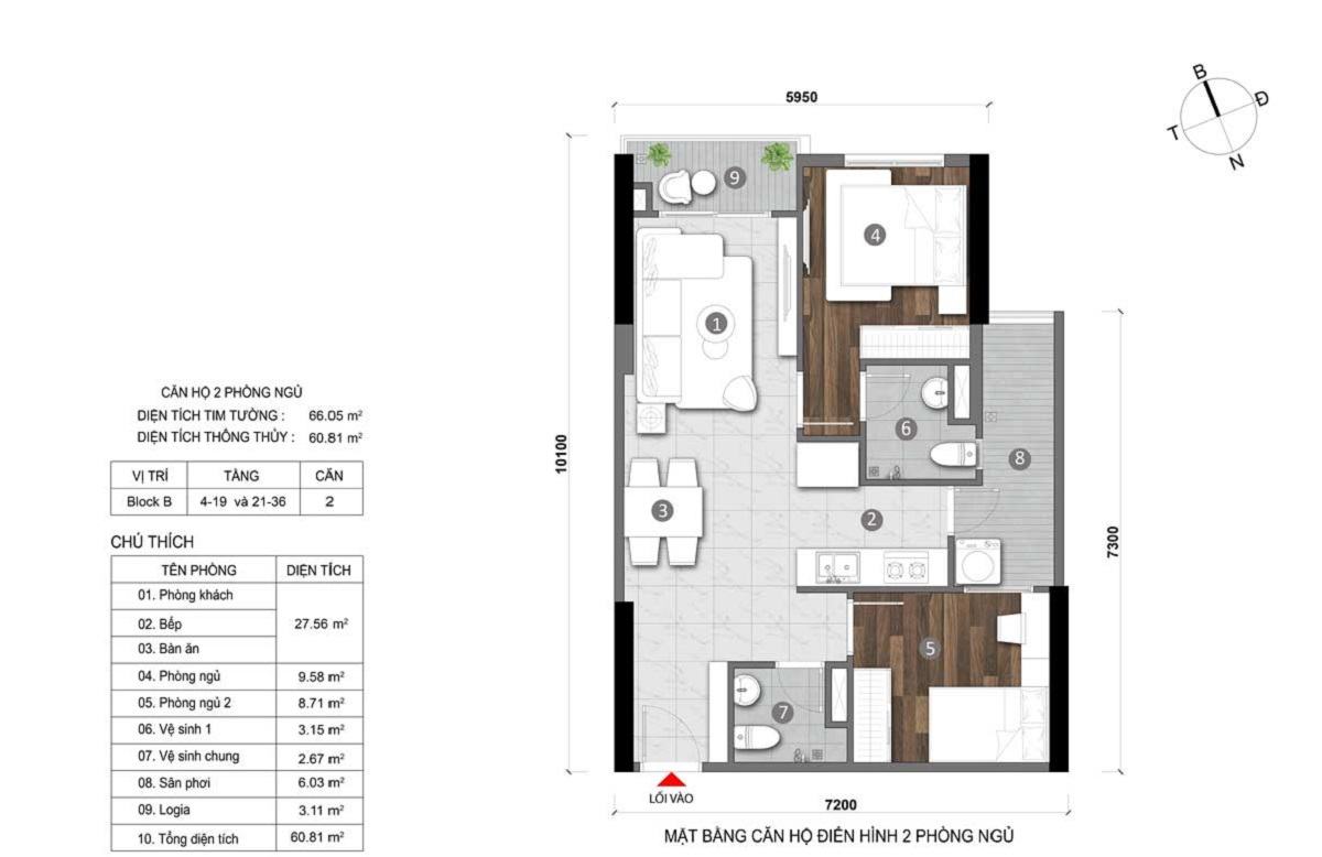 • Căn 2PN: 58 -59 m2 chiếm 63%
