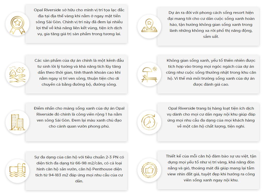 Quận Thủ Đức có tốc độ đô thị hóa nhanh chóng với hạ tầng phát triển mạnh. Đi cùng với xu thế đó, các dự án bất động sản trung và cao cấp đã và đang tạo nên cộng đồng dân cư an sinh kết nối với các giá trị thương mại, dịch vụ tiện ích đa dạng. Trong nhóm bất động sản resort có giá trị gia tăng trên từng mét vuông. Khu căn hộ Opal Riverside với lợi thế cạnh sông dài, mở ra thiên đường nghỉ dưỡng lý tưởng.