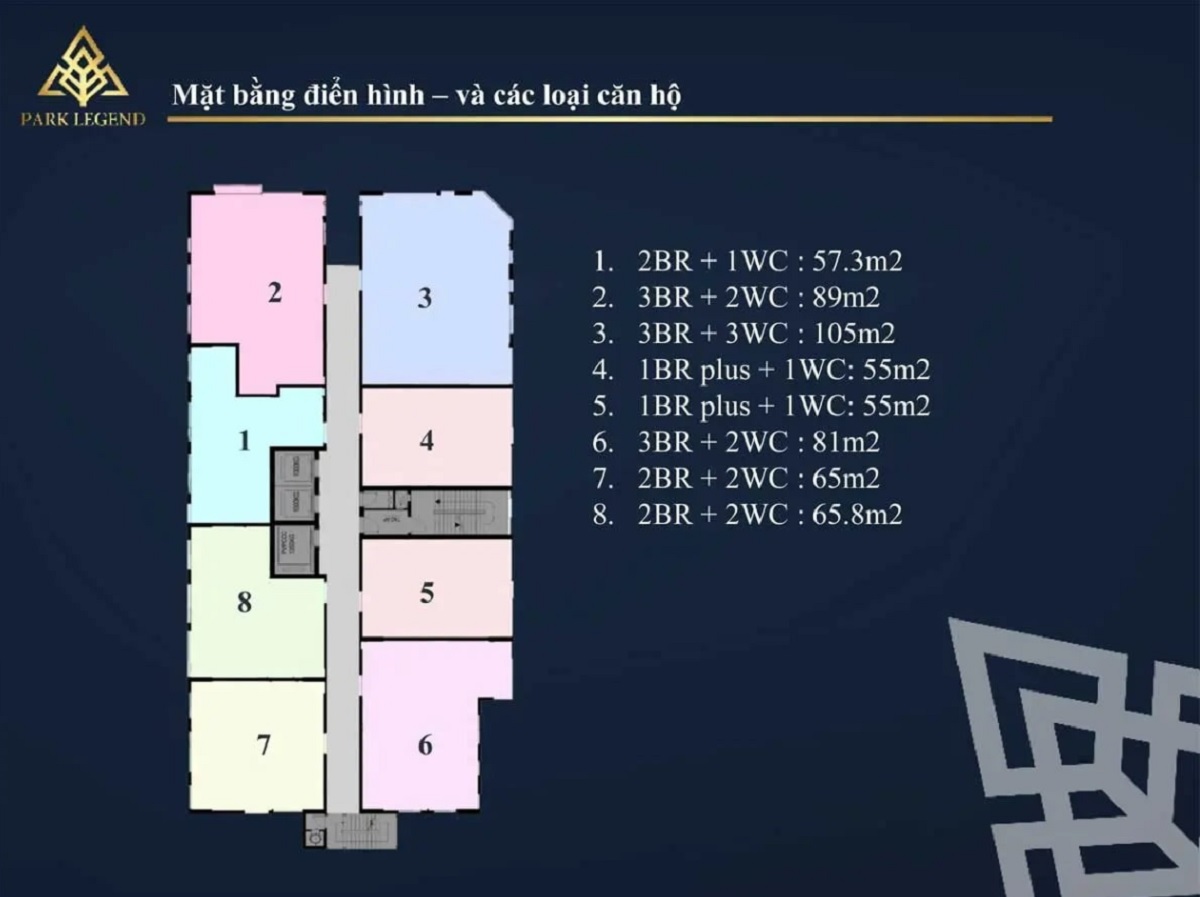 Khách hàng có thể lựa chọn căn hộ dự án Park Legend quy hoạch, thiết kế đồng bộ, hài hòa cùng kiến trúc chung của khu vực. Khách hàng có thể lựa chọn các loại hình căn hộ như sau: