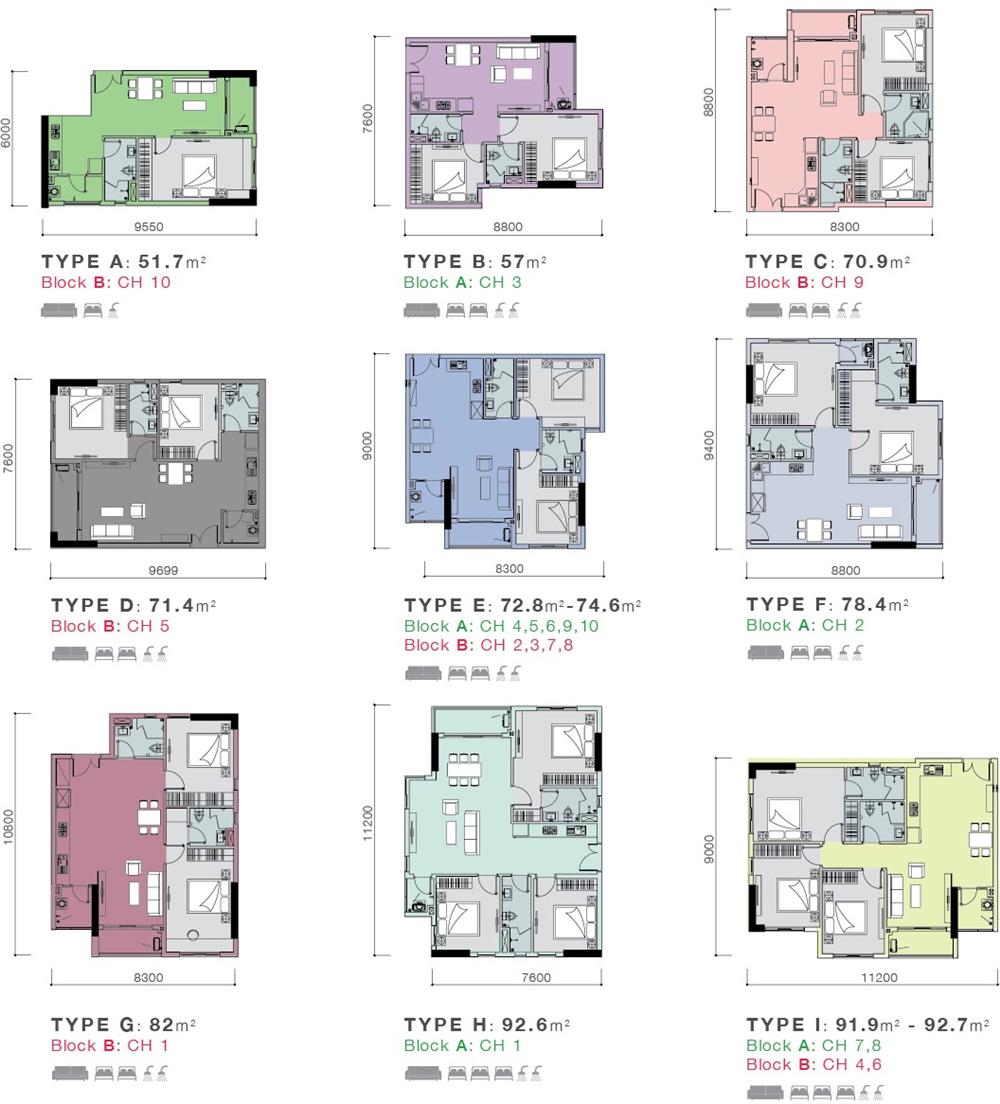 + Từ tầng 4 trở lên bố trí căn hộ đa dạng từ 53.3 m2 – 91.2 m2