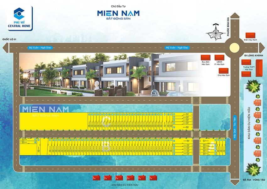 Phú Mỹ Central Home là dự án đất nền với quy mô 1,6 ha gồm 60 nền, do công ty Bất động sản Miền Nam làm chủ đầu tư, toạ lạc dự án nằm trên đường Hắc Dịch – Tóc Tiên, khu phố 4, phường Hắc Dịch, TX Phú Mỹ, tỉnh Bà Rịa – Vũng Tàu.