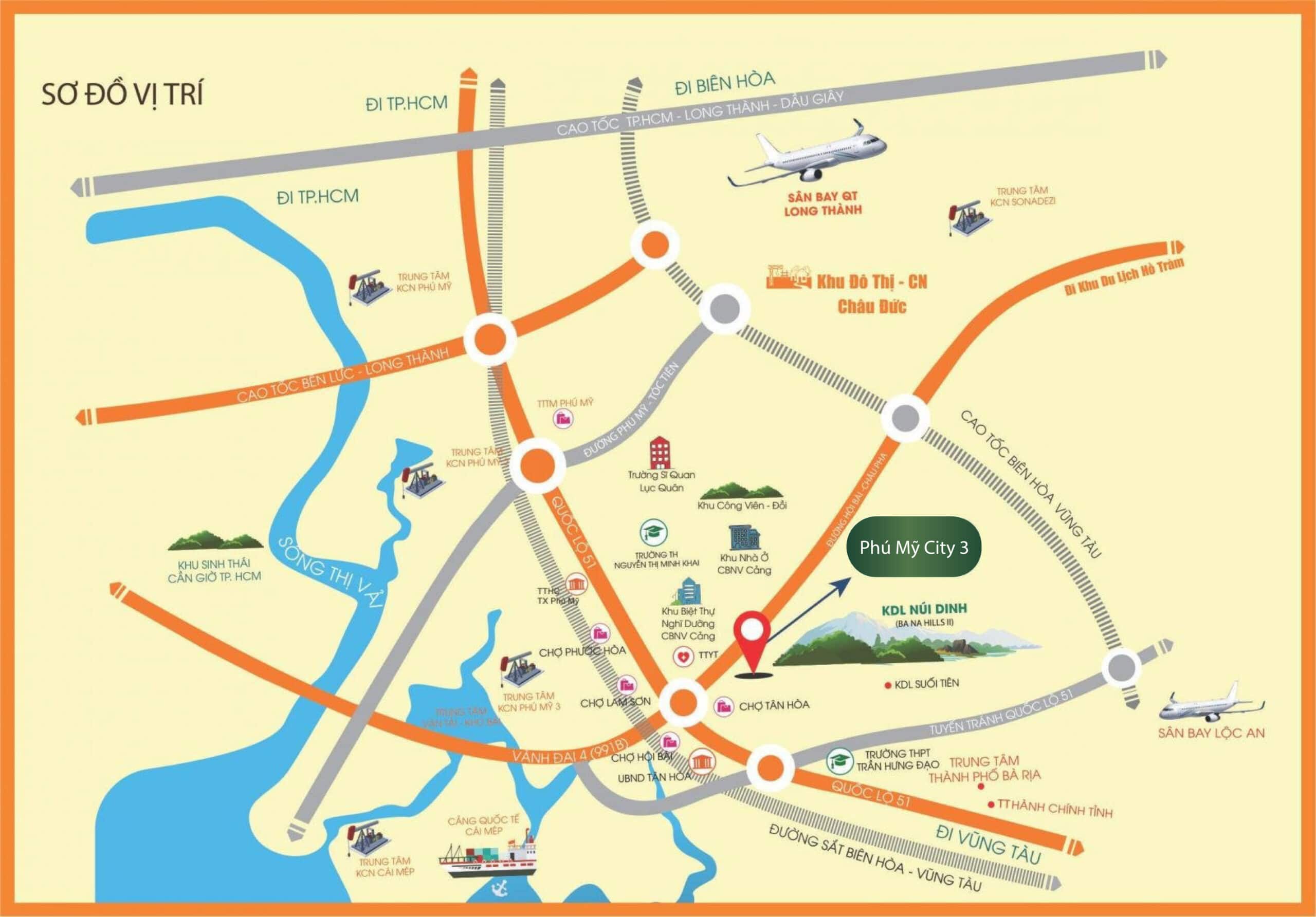 Khu dân cư Phú Mỹ City 3 tọa lạc trên trục đường Hội Bài – Châu Pha (Đường Vành Đai 4 nối dài), Thị xã Phú Mỹ, Tỉnh Bà Rịa – Vũng Tàu. Từ Tp HCM, chỉ cần 60 phút thông qua tuyến cao tốc HCM – Long Thành – Dầu Giây di chuyển để đến Khu dân cư Phú Mỹ City 3.