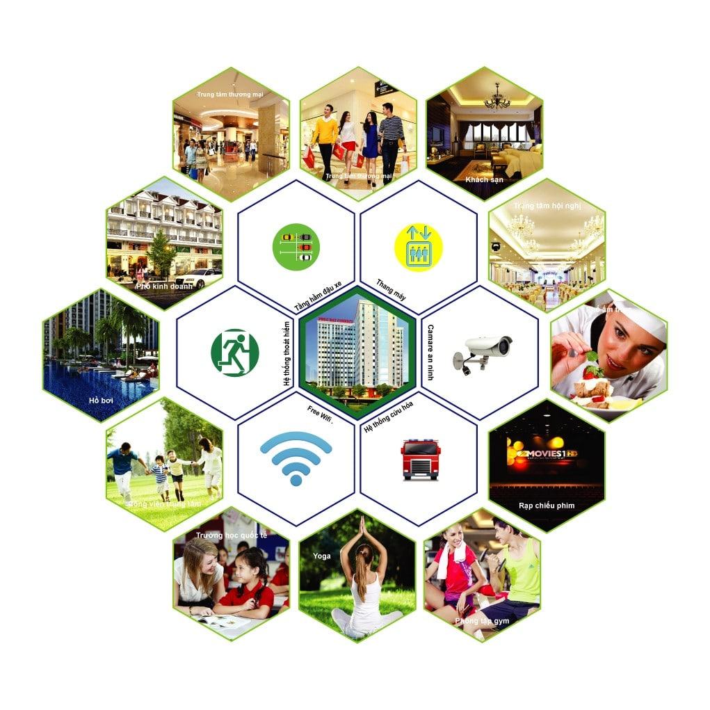 Tiện ích nội khu trong khu đô thị đáp ứng đầy đủ nhu cầu cuộc sống cho cư dân từ vui chơi giải trí, mua sắm đến làm đẹp, chăm sóc sức khỏe. Đặc biệt là hệ thống giáo dục với trường liên cấp 1 và 2 ngay trong khu đô thị.