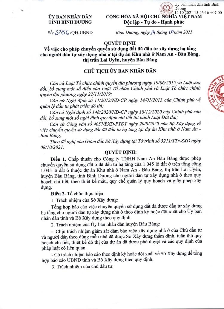 Ngày 14/10/2021: UBND tỉnh Bình Dương ra quyết định số 2356/QĐ-UBND về việc cho phép chuyển quyền sử dụng đất đã đầu tư xây dựng hạ tầng cho người dân tự xây nhà ở tại dự án Khu nhà ở Nam An – Bàu Bàng, thị trấn Lai Uyên, huyện Bàu Bàng.