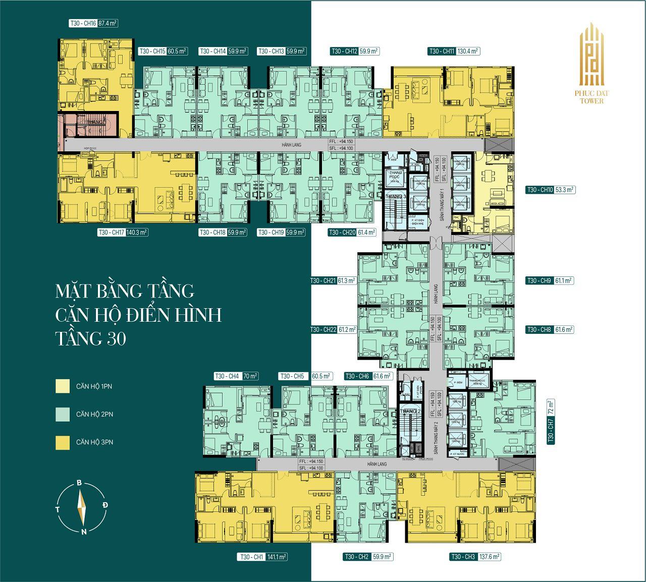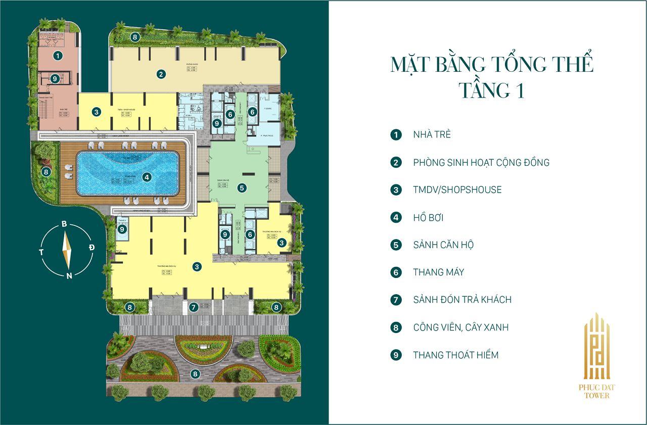 Dự án Phúc Đạt Tower được xây dựng với 2 tháp A – B liền kề, gồm 2 tầng hầm thông nhau và 30 tầng cao. Trong đó, tầng 1 – 3 là shophouse và tiện ích, từ tầng 4 – 29 là căn hộ điển hình, tầng 30 là tầng Penhouse. Số lượng căn hộ và diện tích chi tiết như sau: