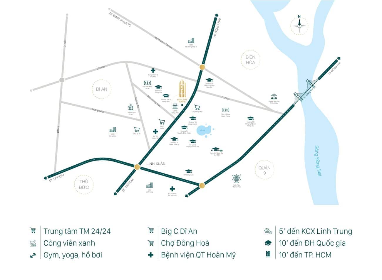 Nhất cận Thị, điều này quá rõ ràng khi đối diện với Phúc Đạt Tower là chợ Đông Hòa, di chuyển thêm 900m theo Quốc lộ 1K là tới Trung tâm thương mại Big C Dĩ An.