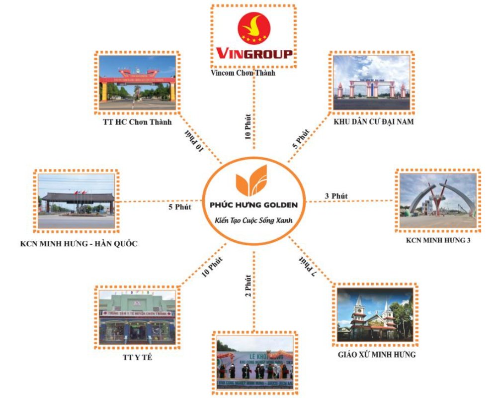Ngoài tiện ích nội khu nổi bật trên thì dự án Phúc Hưng Golden liền kề với KCN Minh Hưng và trung tâm huyện Chơn Thành, trung tâm phát triển của Minh Hưng, trường học các cấp, cách chợ Minh Hưng, chợ truyền thống, siêu thị, trung tâm thương mại, trạm y tế, ngân hàng, cây xăng đang hoạt động trong bán kính chỉ từ 2 km.
