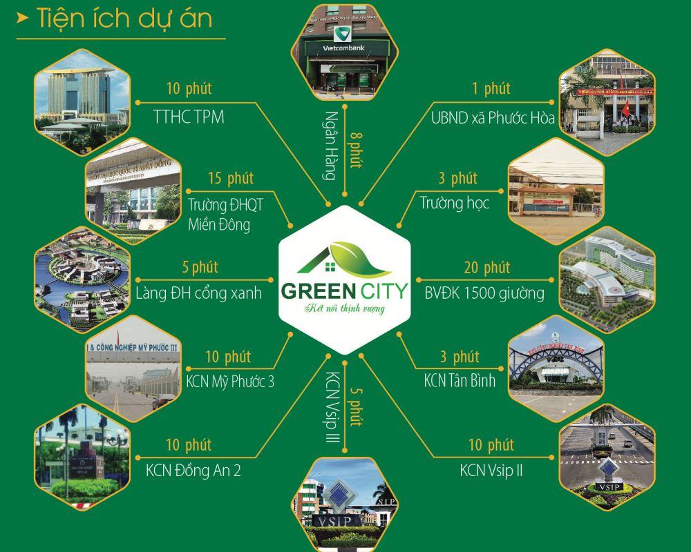 Đặt biệt, cư dân sống tại Green City Bình Dương mất 5-10 phút để di chuyển đến các trung tâm phát triển như làng Đại học Cổng Xanh, trung tâm thương mại thế giới TP. Mới Bình Dương, trung tâm hành chính tỉnh Bình Dương và Từ các tiện ích sẳn có như trường cấp 1, 2, 3 Phước Hoà, UBND Phước Hoà, chợ, Ngân Hàng, khu công nghiệp Tân Bình