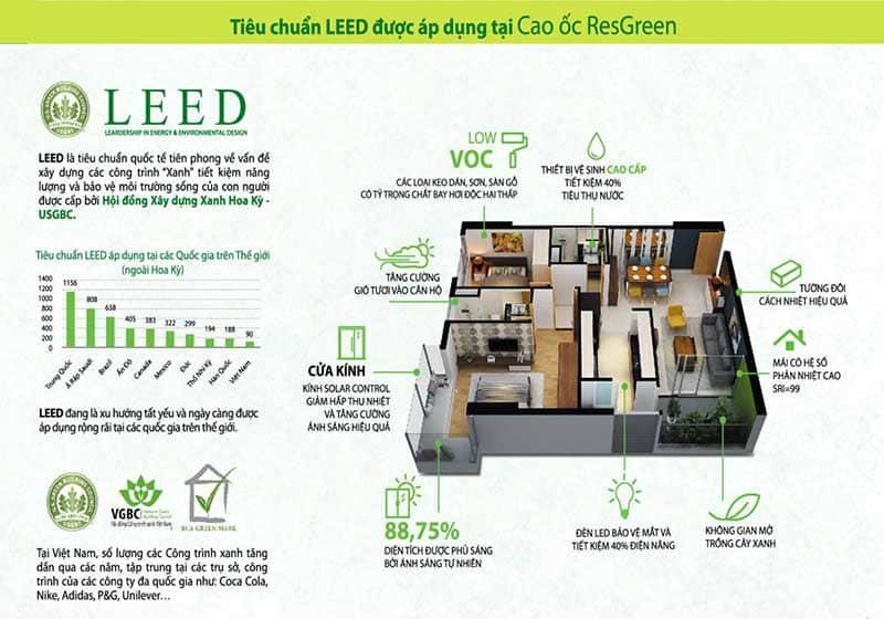 ResGreen Tower thực hiện đúng yếu tố tiêu chuẩn Xanh Hoa Kỳ, căn hộ được lựa chọn sử dụng loại keo dán, sơn, sàn gỗ,… có tỷ lệ chất bay hơi độc hại thấp, các nội thất thiết bị điện – nước thông minh giúp tiết kiệm 40% lượng tiêu thụ điện – nước.