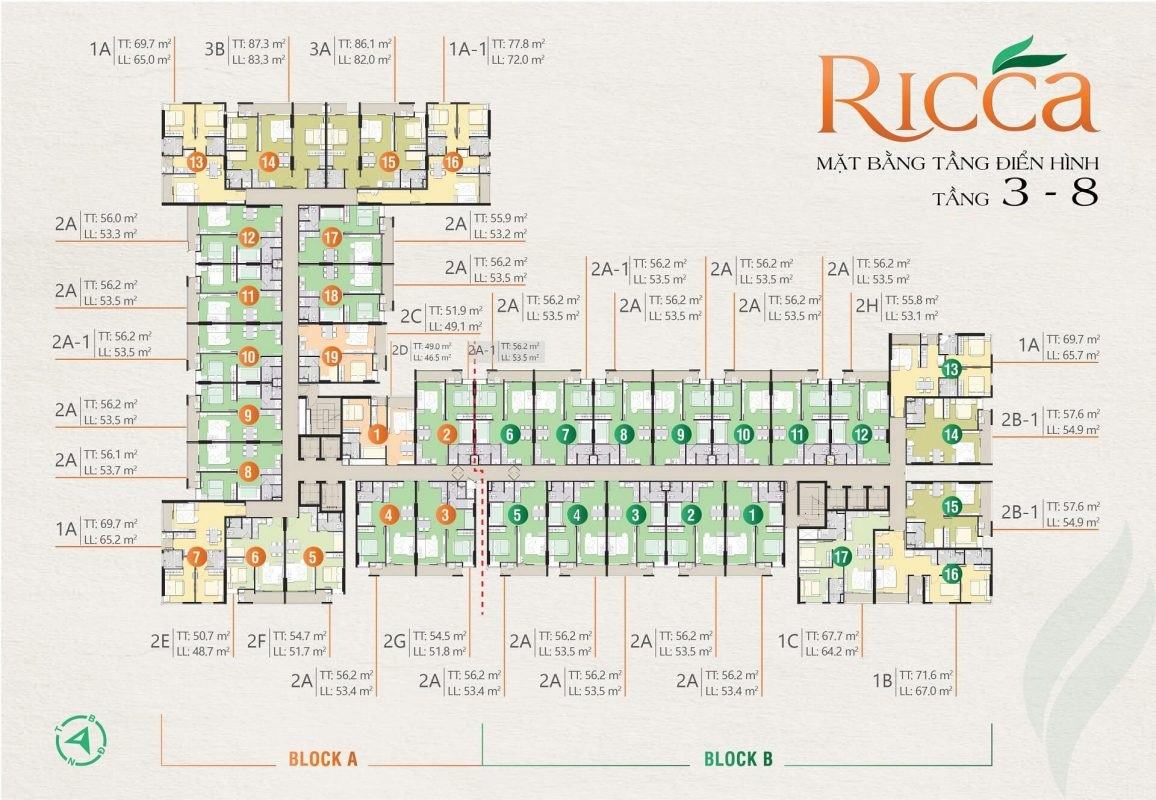 Dự án căn hộ Ricca được chia làm 02 Block với tổng số căn hộ là 524. Đối với mặt bằng điển hình của Block A có tổng số căn là 19 – 20 căn/sàn, số lượng thang máy là 4 thang. Block B có 17 căn/sàn, số lượng thang máy là 03. Mặt bằng dự án căn hộ Ricca được thiết kế thông thoáng, tất cả các căn đều đón nắng, gió tự nhiên, không bị chắn view nhìn.