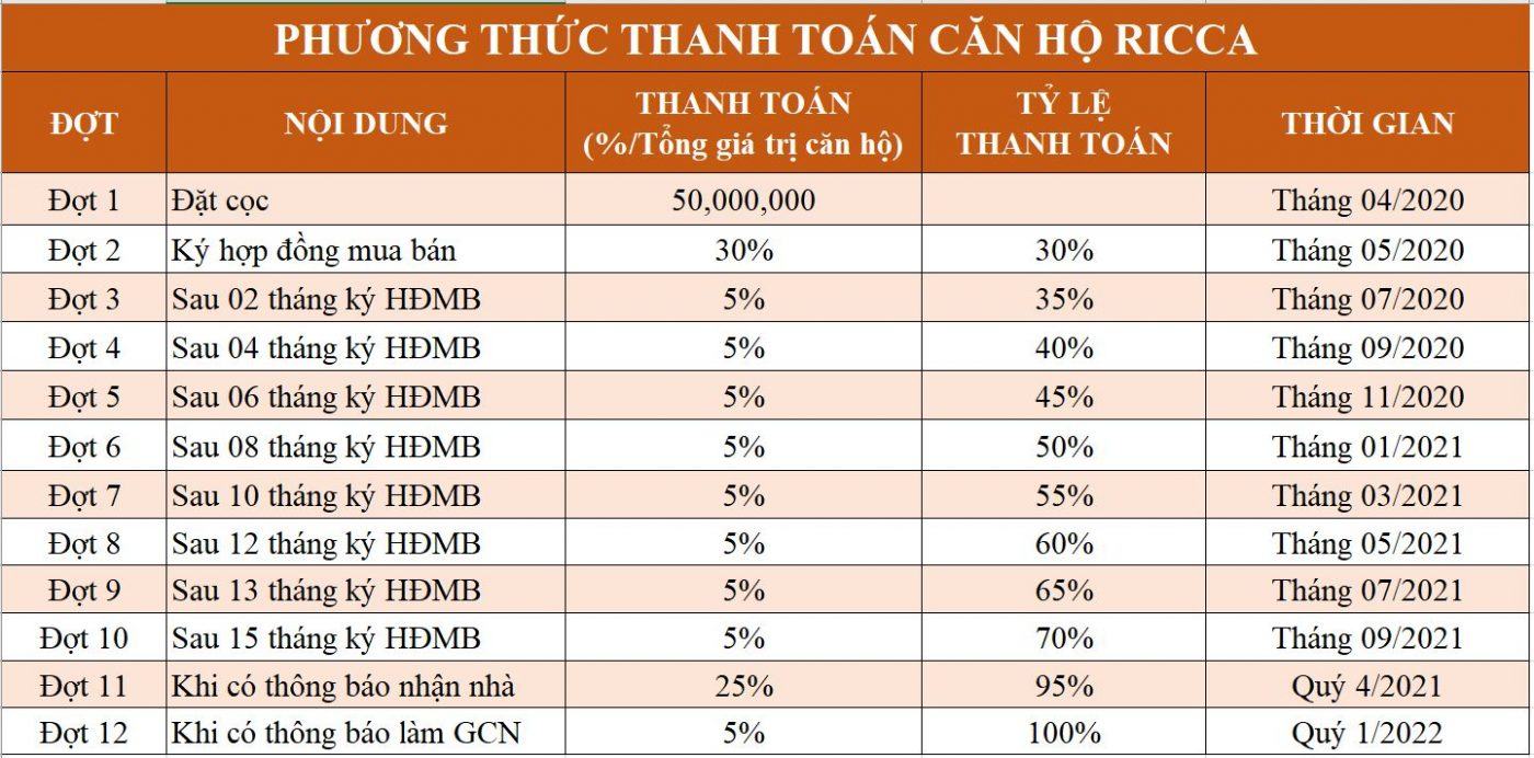 Phương thức thanh toán dự án căn hộ RICCA cực kỳ hấp dẫn chỉ 2,5%/tháng.