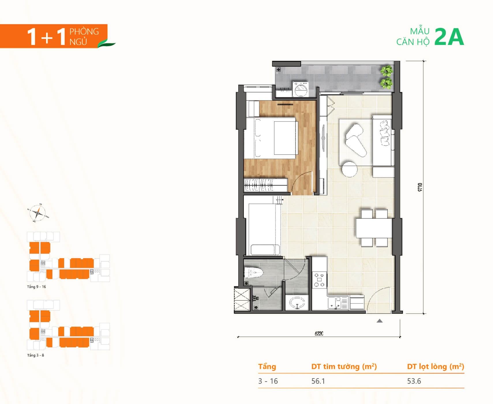 | A.xx.03 | 1+1PN – 1WC | 54.5m² | Đông Nam- View Sông | 1,75 – 1,85 tỷ | Đã bao gồm tất cả |