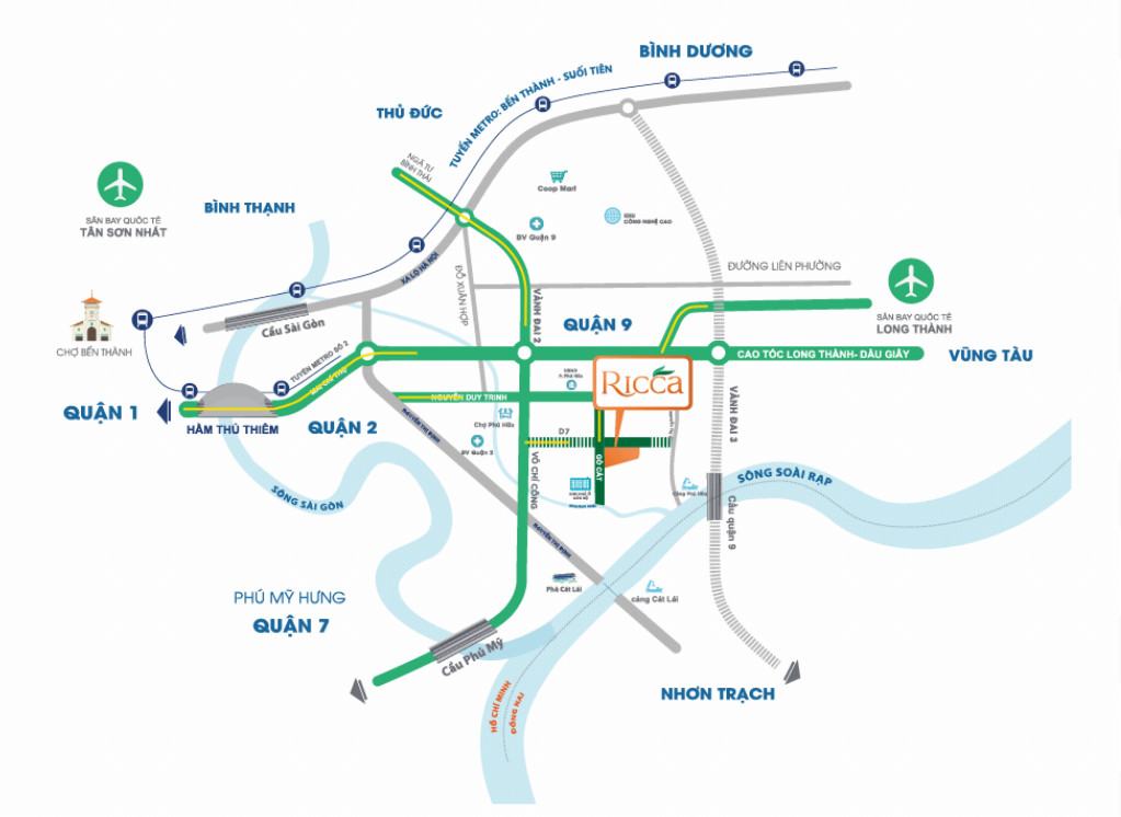 Vị trí dự án Ricca tọa lạc ngay đô thị tri thức trẻ, giàu tiềm năng gia tăng trong tương lai, Ricca kết nối trực tiếp với các quận trung tâm, trường học, bệnh viện quốc tế, kết nối Thủ Thiêm, Phú Mỹ Hưng, trung tâm thành phố vô cùng thuận tiện. Ricca tận dụng tối đa tiện ích của khu vực, dễ dàng kết nối với các trung tâm hành chính, trường học, bệnh viện, khu vui chơi, trung tâm thương mại, giải trí,..