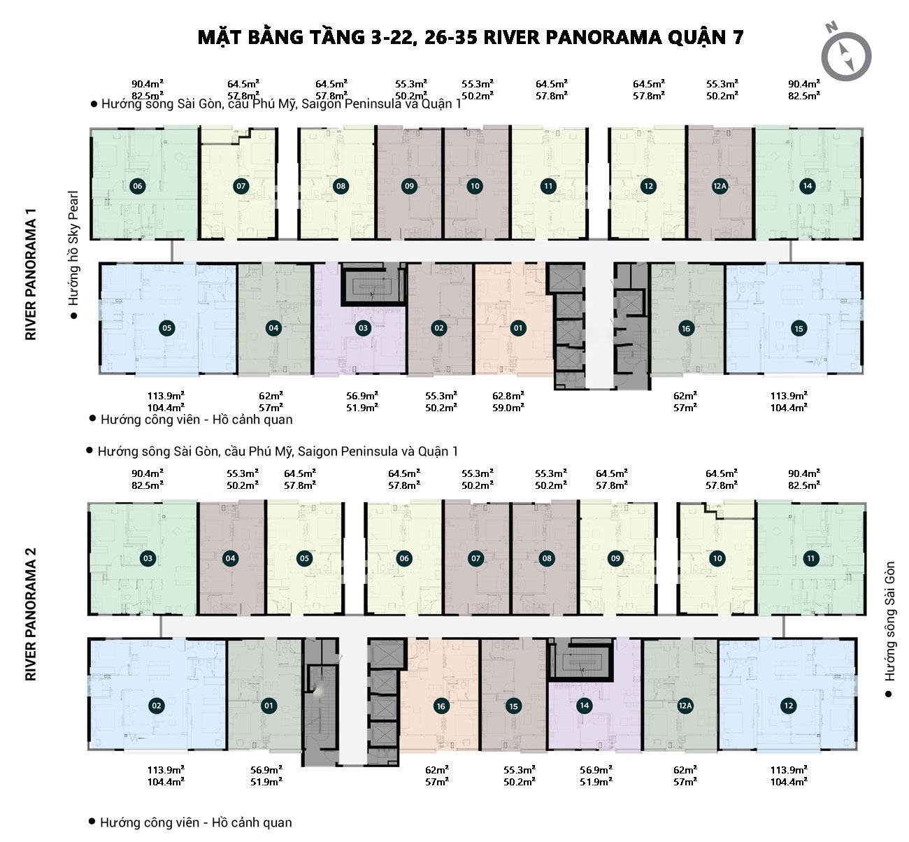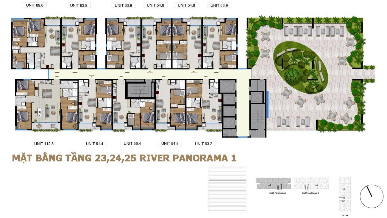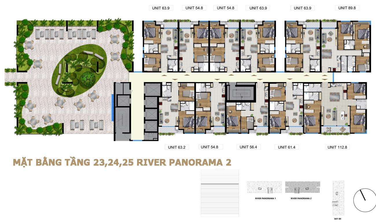 Các căn hộ của dự án River Panorama đa dạng diện tích cho khách hàng lựa chọn từ 55.3 m2 – 113.9 m2 được thiết kế theo phong cách hiến đại nhằm giúp tối ưu diện tích và công năng sử dụng. Toàn bộ căn hộ đều có khả năng lấy ánh sáng, nắng và gió tự nhiên, gần gũi thiên nhiên trong lành.
