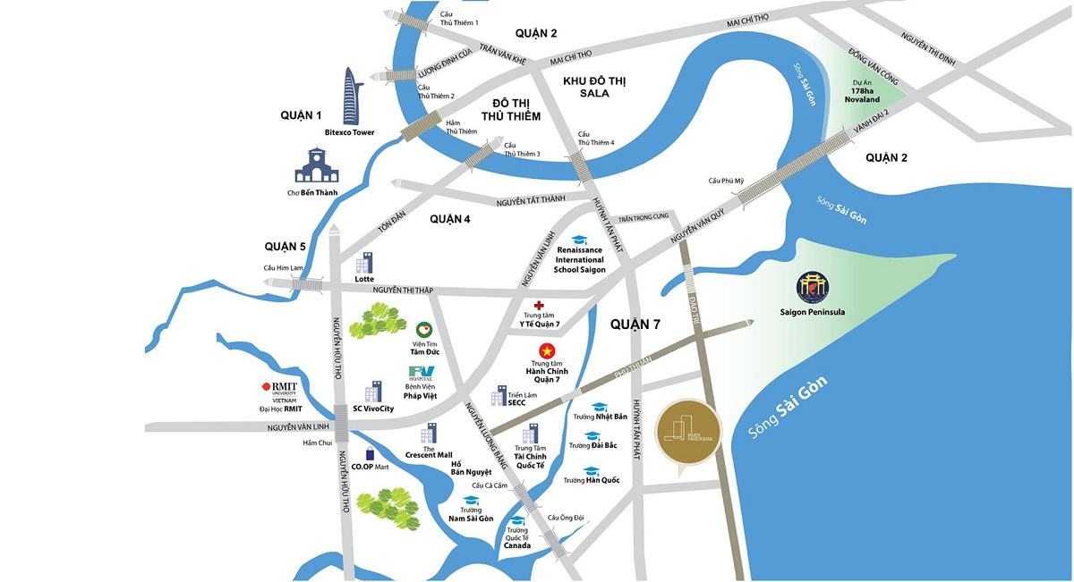 Ngoài ra, trong bán kính 3km, cư dân của River Panorama dễ di chuyển đến những vùng tiệm cận: