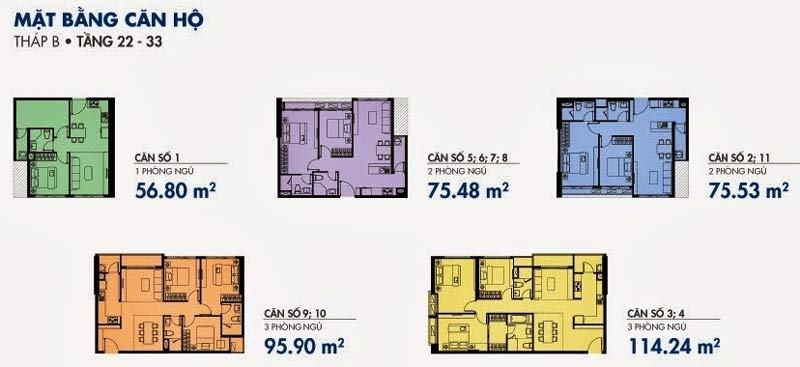 Dự án cung cấp cho khách hàng đa dạng loại hình căn hộ từ 1 – 3 phòng ngủ, diện tích từ khoảng 56m2 – 114m2.