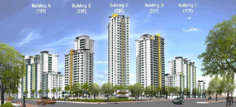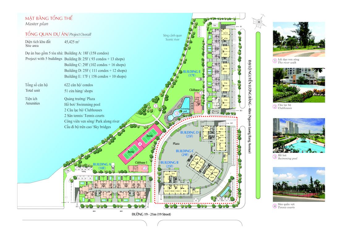 Riverside Residence có quy mô thiết kế bao gồm có 622 căn hộ + 51 cửa hàng được bố trí trong 5 dãy nhà A, B, C, D, E với chiều cao từ 17 – 29.