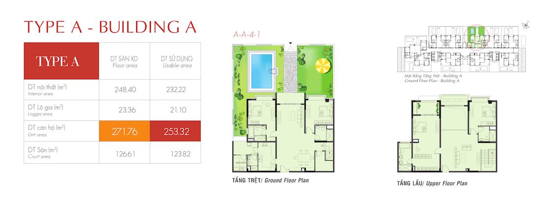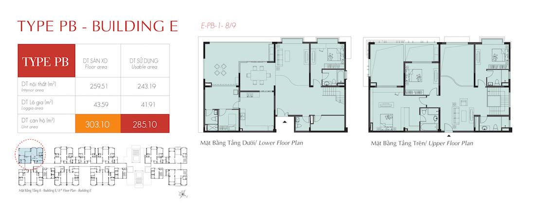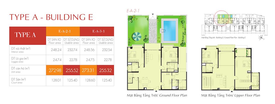 Quy mô các căn hộ của dự án có diện tích đa dạng với 3 kiểu nhà cơ bản bao gồm: căn hộ 2 tầng được bố trí ở tại tầng 1 và 2 của hai tòa tháp A và E. Điểm đặc biệt của loại hình căn hộ kiểu này đó chính là có hồ bơi mini trong vườn chính với tầm view nhìn hướng ra công viên; bờ sông.