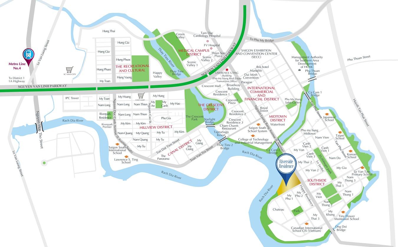 Riverside Residence tọa lạc trong Khu Nam Viên thuộc đô thị Phú Mỹ Hưng. Với vị trí lý tưởng tọa lạc ven sông, Riverside Residence sở hữu một vị trí hiếm có giữa lòng đô thị, mang đến cho dân cư nơi đây không những một môi trường sống cực kì hiện đại mà còn rất thân thiện với môi trường.