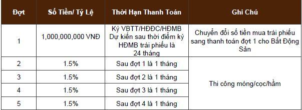 Hiện tại chủ đầu tư đang có chương trình về GÓI TRÁI PHIẾU VÀ ĐẶC QUYỀN ƯU TIÊN bất động sản đang rất thu hút khách hàng với HĐMB trái phiếu có tổng giá trị là 1 tỷ VND được chia thành 2 đợt thanh toán: