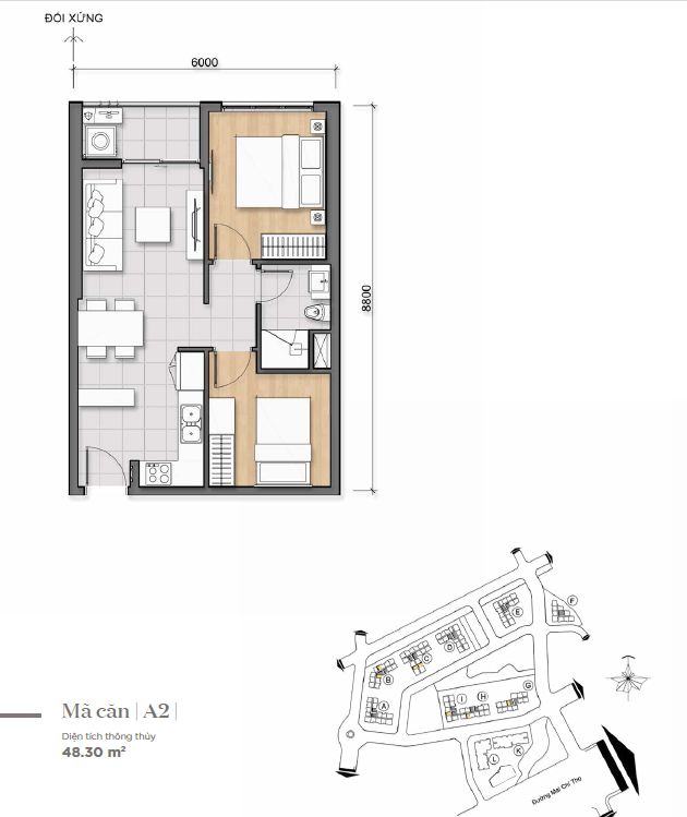 + Loại 1 + 1phòng ngủ: diện tích 48,30m2